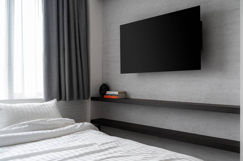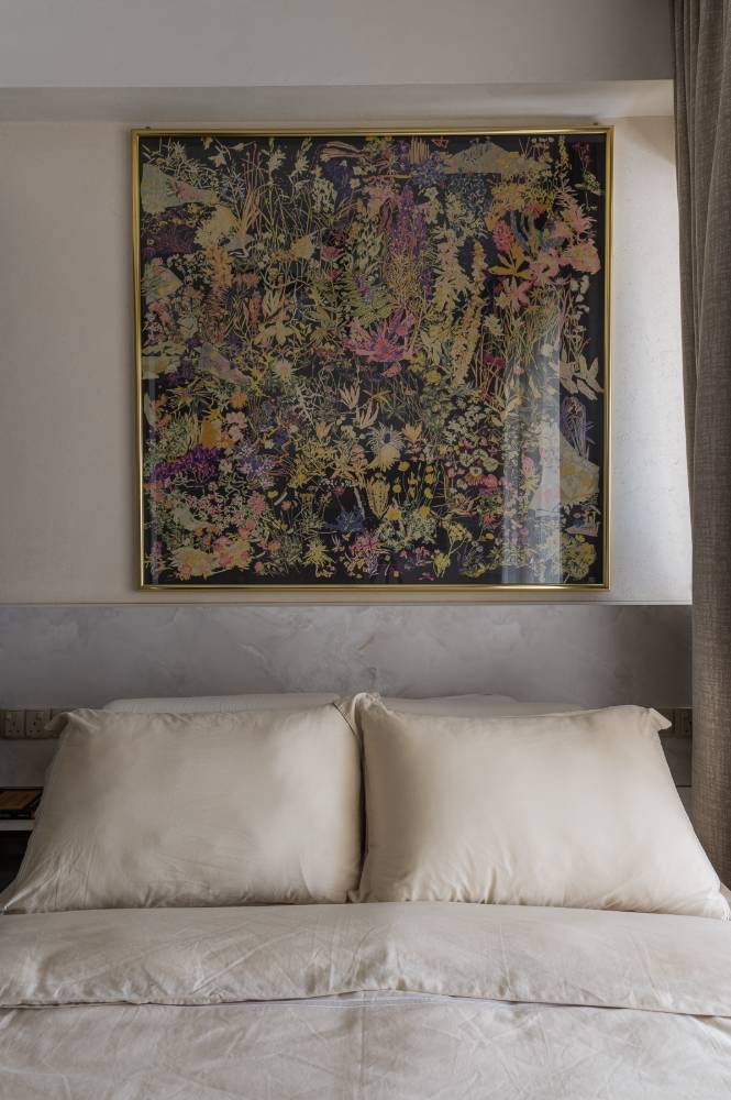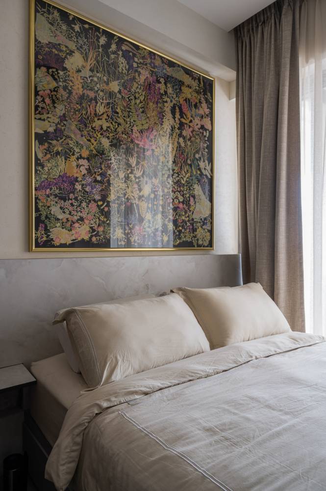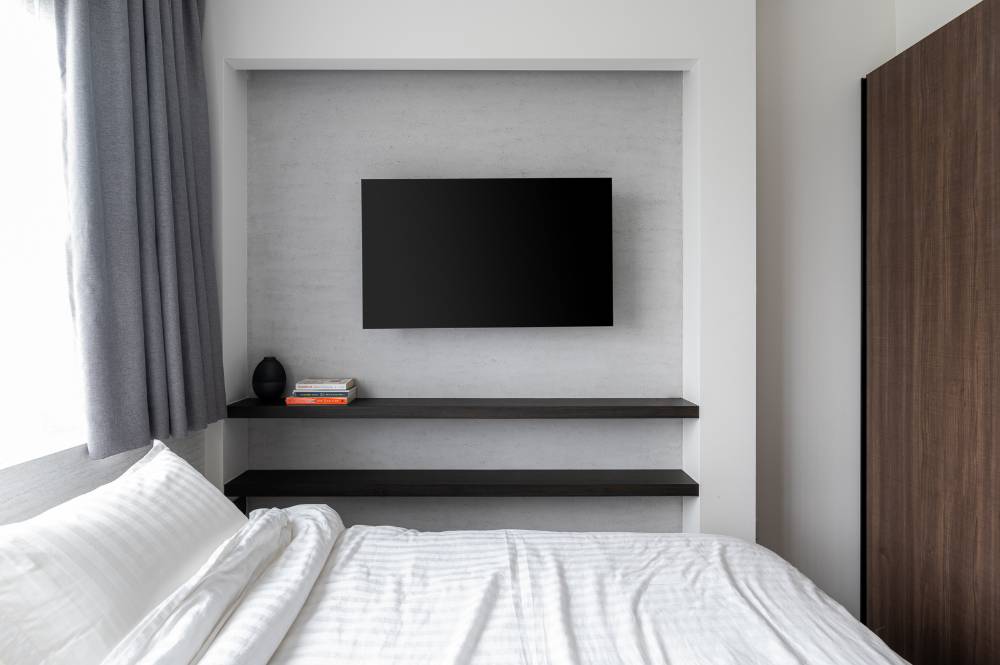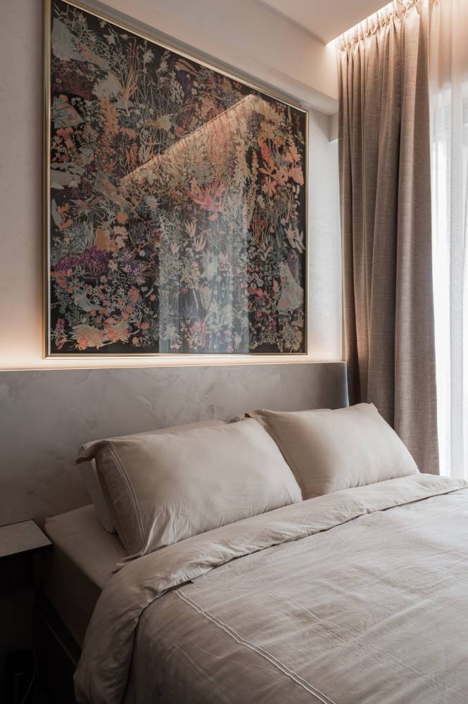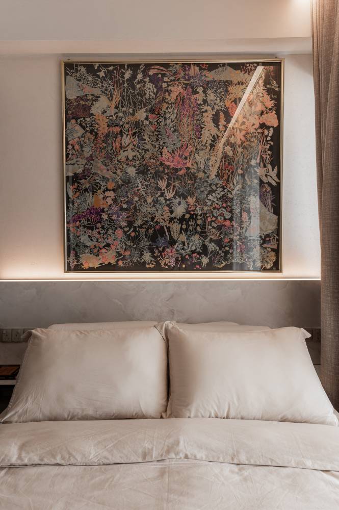 Designed as a luxurious "mini hotel room", the suite features a dedicated mini landing zone at the entry to set a private mood. Key features include a low-profile bed platform and a bespoke wall system for the TV console and integrated shelving, maximizing both function and floor space while fully embodying the hotel suite concept.