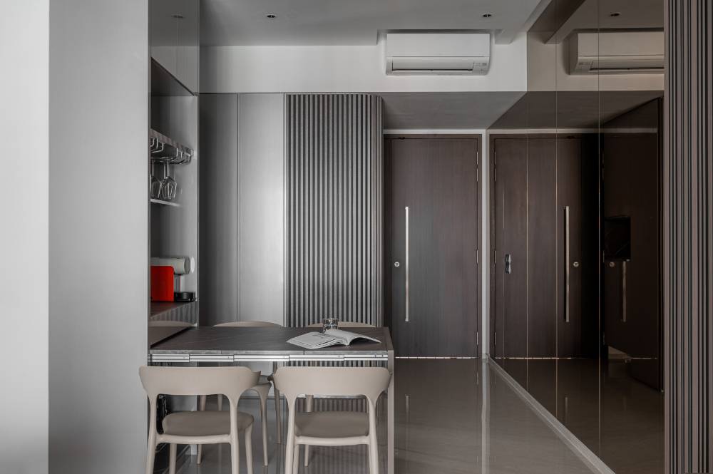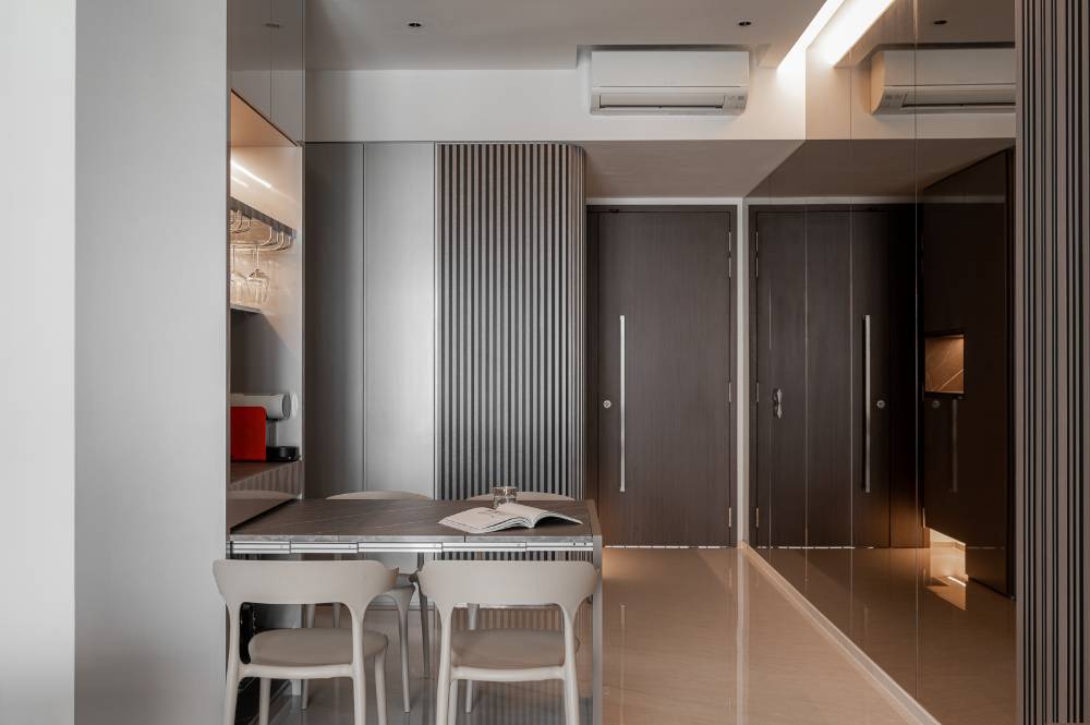 This area is defined by its clever use of space and versatility. The main dining space features a foldable mini bar/tabletop, designed to be entirely kept away when not in use. This flexibility allows the entrance area to be expanded or kept open, maximizing circulation and ensuring the space adapts seamlessly to different hosting or daily needs.