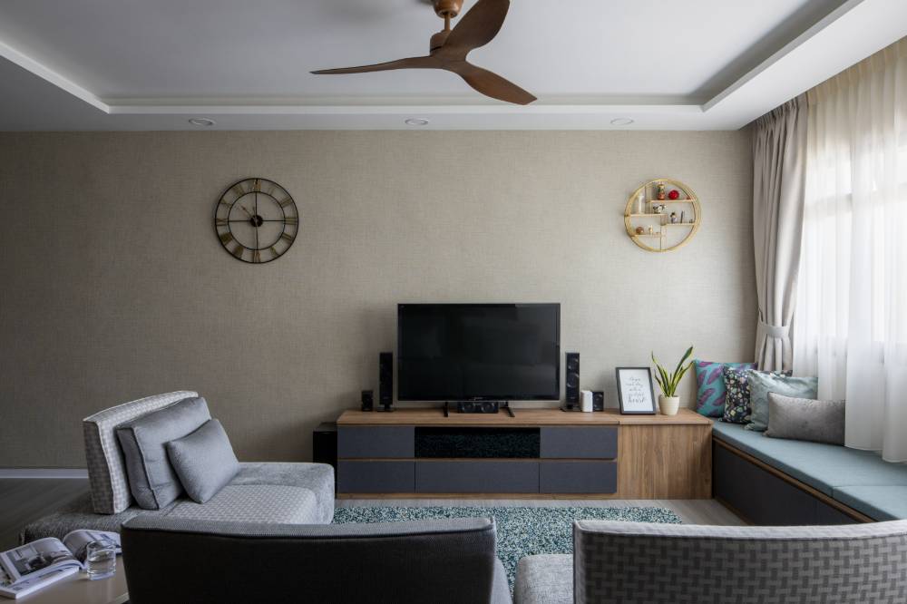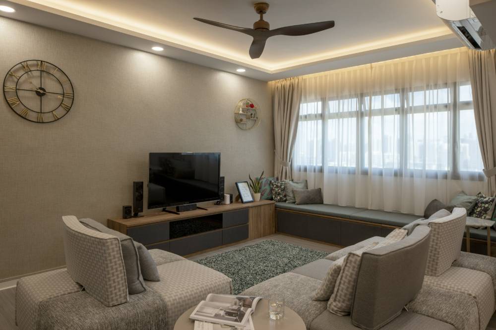This is a dedicated four-sided living space intentionally designed to unify the family and maximize guest capacity. A long sofa lounge is custom-built to perfectly fit along the entire length of the window wall, ensuring ample, comfortable seating for both daily use and larger social gatherings.