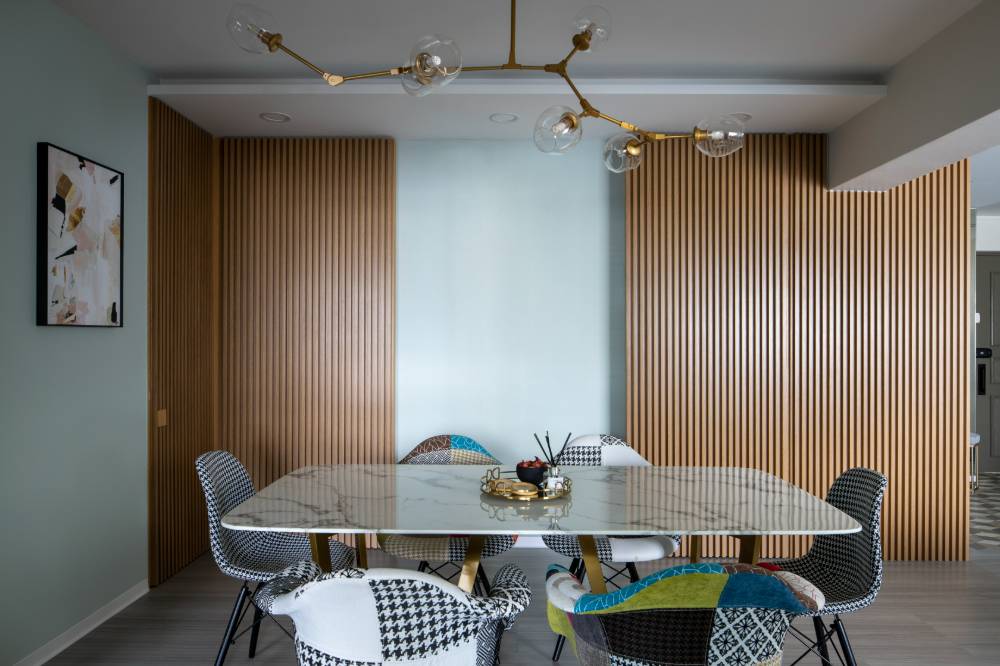 Blending minimalism with a cozy cottage aesthetic, the dining area is the home's central hub. The space is intentionally kept seamless and centralized by the inclusion of a clever hidden door concealed behind the main dining wall, providing private access to the kitchen without disrupting the area's clean, unified look.