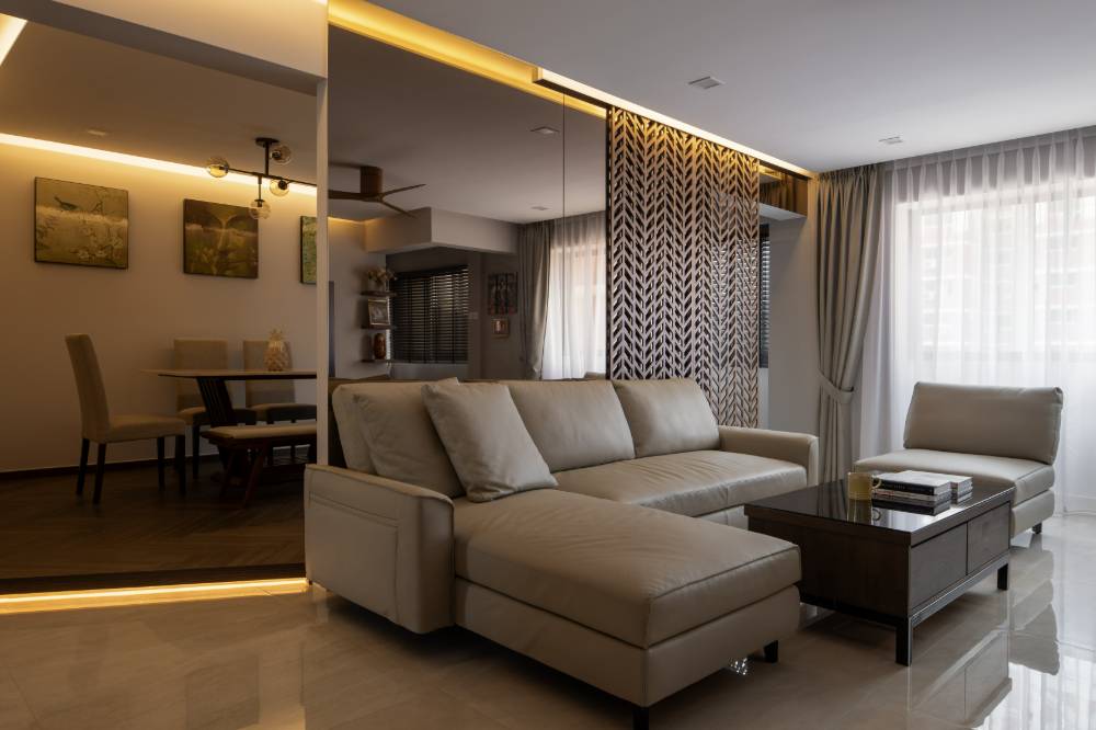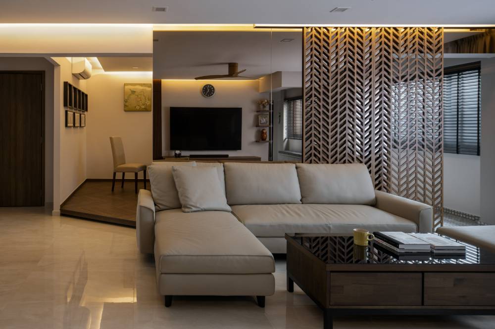 442 Sin Ming stands as a testament to sophisticated spatial planning and cohesive design, skillfully demonstrating The Art of Division. The project successfully blends distinct zones, like the elevated, semi-private dining area, with an overall sense of flow and openness. This approach is also evident in the luxurious master suite, which features cleverly defined areas for the walk-in closet and high-end bathroom finishes. Paired with an efficient, elegant kitchen, the home embodies contemporary living. We achieved a harmonious balance of form and function, delivering a unique, refined, and highly personalized environment for the client.