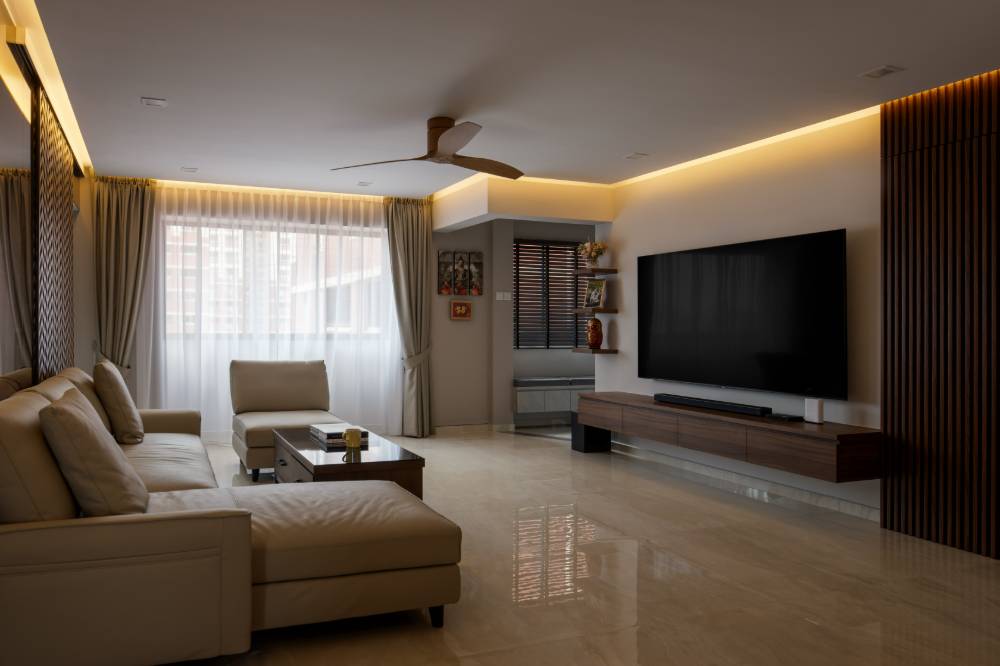The living area at 442 Sin Ming sets a striking, contemporary tone. Defined by rich textures and a refined neutral palette, the space features custom carpentry and sophisticated finishes. It is a bright, inviting focal point designed for comfort and modern style.